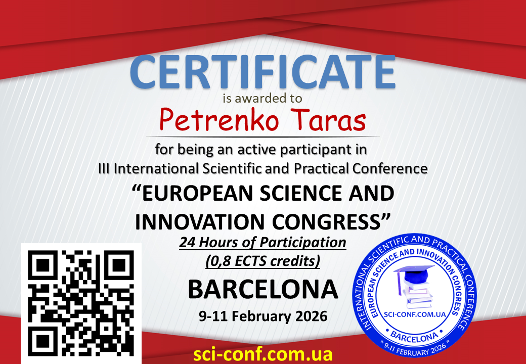 Тези учасників будуть опубліковані у збірнику із присвоєнням ISBN 978-84-15927-36-5 та УДК, вихідні дані м. Барселона, Іспанія, випуск в електронному варіанті (Conference PROCEEDINGS) буде доступний на нашому сайті не пізніше 19.02.2026 року.