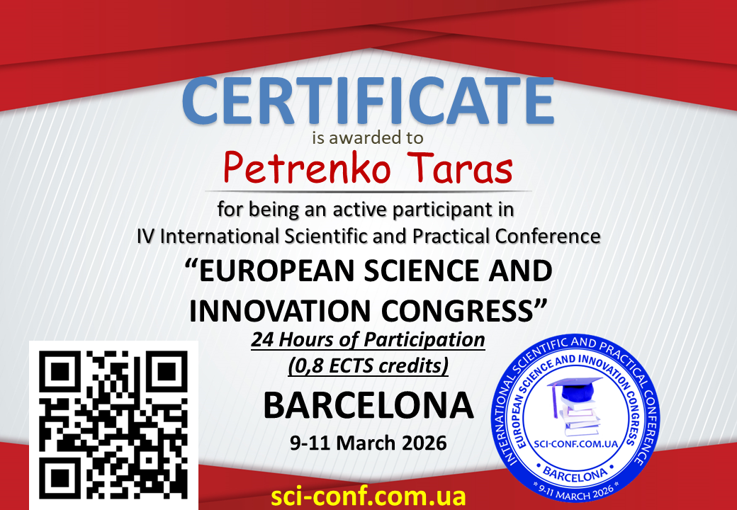 Тези учасників будуть опубліковані у збірнику із присвоєнням ISBN 978-84-15927-36-5 та УДК, вихідні дані м. Барселона, Іспанія, випуск в електронному варіанті (Conference PROCEEDINGS) буде доступний на нашому сайті не пізніше 19.03.2026 року.
