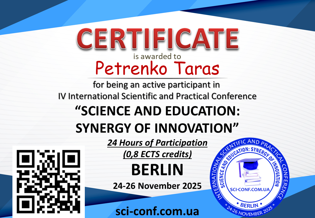 Тези учасників будуть опубліковані у збірнику із присвоєнням ISBN 978-3-954753-01-7 та УДК, вихідні дані м. Берлін, Німеччина, випуск в електронному варіанті (Conference PROCEEDINGS) буде доступний на нашому сайті не пізніше 4.12.2025 року.