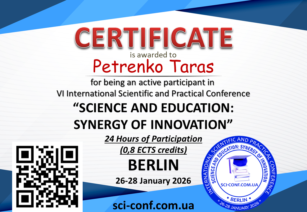 Тези учасників будуть опубліковані у збірнику із присвоєнням ISBN 978-3-954753-01-7 та УДК, вихідні дані м. Берлін, Німеччина, випуск в електронному варіанті (Conference PROCEEDINGS) буде доступний на нашому сайті не пізніше 5.02.2026 року.