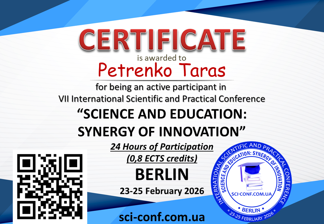 Тези учасників будуть опубліковані у збірнику із присвоєнням ISBN 978-3-954753-01-7 та УДК, вихідні дані м. Берлін, Німеччина, випуск в електронному варіанті (Conference PROCEEDINGS) буде доступний на нашому сайті не пізніше 5.03.2026 року.